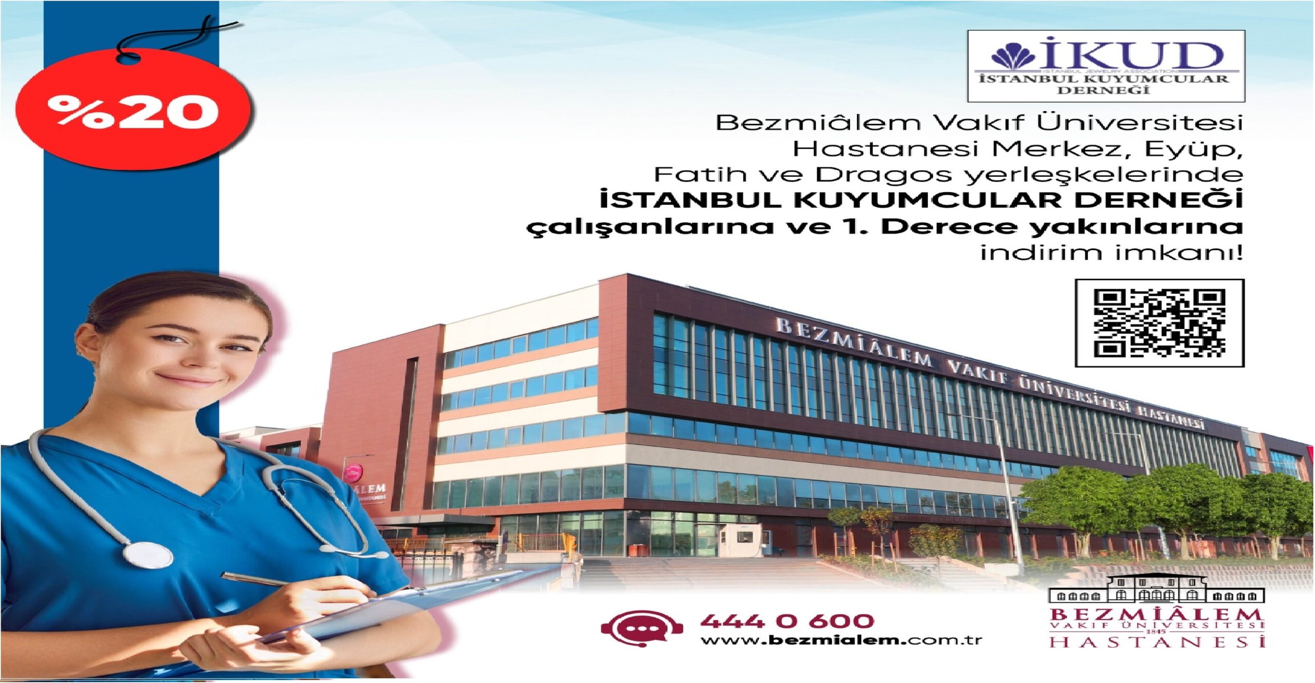 Bezmialem Vakıf Üniversitesi Sağlık Uygulama ve Araştırma Hastanelerinde üyelerimize ve 1.derece yakınları ( Anne, Baba, Eş ve Çocuk ) her türlü ayakta ya da yatarak acil serviste tedavi, tedavi ve ameliyat dahil tüm hizmetlerin (Diş hekimliği tedavileri, ve özel hizmetler hariç) fiyatlandırılmasında, hastanenin o günkü cari ücret tarifesi üzerinden yapılacak olan %20 indirimden yararlanmaktadır.